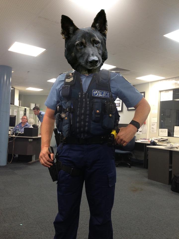 Standing there in his cop uniform in all his glory was Rumble the cop dog complete with his gun and stuff (ask a cop if you don’t know what ‘stuff’ is). Next to him stood the beautifully stunning female cop dog ‘Z’ in her cop dog uniform also with her gun and stuff.