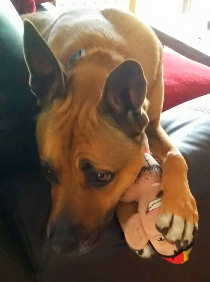 Brutus and his beloved Tony Abbot doll that he really did take in to hospital