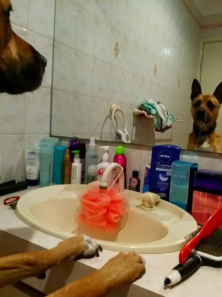 Dog in the mirror Published November 15, 2015 at 720 × 960 in Pippin Pringle, Brutus and the ‘Testicle Incident’